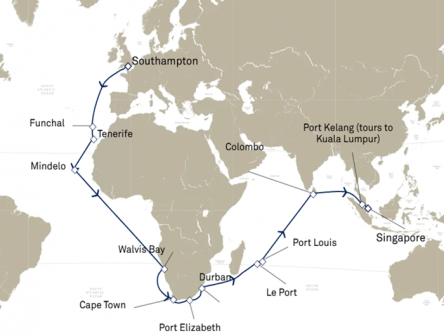42泊のクルーズでは、シンガポールのミシュランの星を獲得した屋台料理をはじめ、いつまでも心に残る素晴らしい体験を多数ご用意しているほか、カーボベルデ、南アフリカ、モーリシャス、スリランカなどにも寄港します。