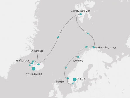 この素晴らしい2週間の航海は、訪れる目的地と同様に魅力に満ちています。アイスランドの首都レイキャビクを出発し、まずはブルーラグーンでリフレッシュ。続いて、イーサフィヨルズルやアークレイリといった美しい海岸沿いの街を巡り、自然の壮大さを堪能します。海上で2日間の休息を経て、北極のロングイェールビーンに到着。氷河と山々に囲まれた静かな町で、心身ともにリラックスするひととき。フィヨルドではクジラやトナカイが姿を見せ、南下する中でノルウェー最北端のホニングスヴォーグや、レクネスの白砂のビーチ、歴史的なベルゲンを探索します。最後はノルウェーの首都オスロで航海を締めくくります。