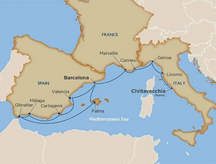 地中海を巡る優雅なクルーズで、スペイン、フランス、イタリアの魅力を満喫。マラガからローマまで、美しい港町や歴史的な名所を訪れ、グルメや文化を堪能する至福の旅です。
