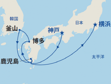 神戸から乗船し、九州、韓国に寄港して横浜で下船するコース。