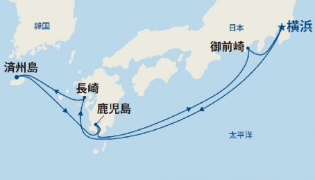 横浜を出港し済州島と長崎・鹿児島・御前崎を訪れるコース