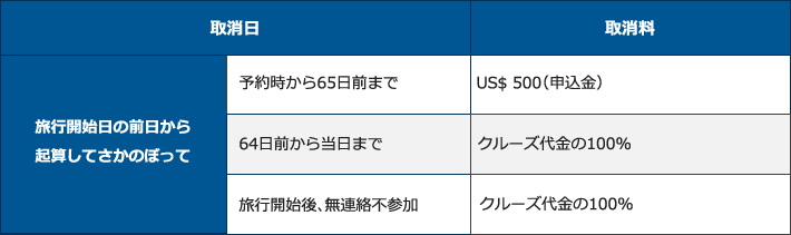 | 残金のお支払 | 旅行開始日の65日前までにクルーズ代金残金をお支払いただきます。 |