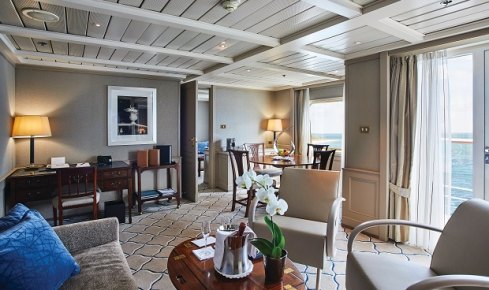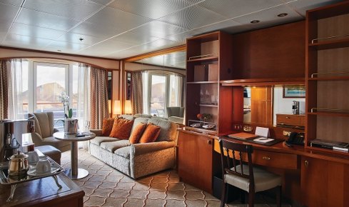 各スイートの電話からは船内および陸上へ直接電話することができます。陸上への電話は衛星通信を利用するため、 つながりにくいことがございます。