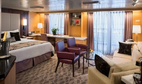 - ツインベッド(キングサイズベッド×1に変更可能)、2シンク洗面台、ジャグジー付きバスタブ&シャワー、シャワー室、広めのリビングエリア、ドレッシングルーム、専用ベランダ、2名用ソファーベッド×1、床から天井までのガラスドア。