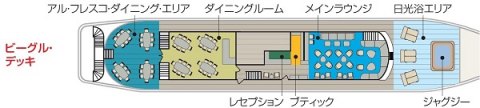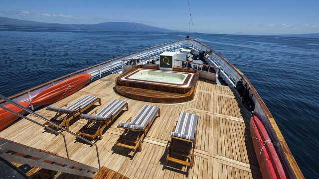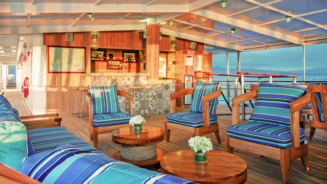 船内には屋内と屋外のダイニングエリアやバー、ラウンジ、スライドショー、映画上映などの施設、ラウンジには、プレイステーションシステムや60インチテレビ、日光浴や野生生物観察が出来る屋外のデッキスペース、ブティックや医務室などの設備も整っていて快適なガラパゴス諸島クルーズもお楽しみいただけます。