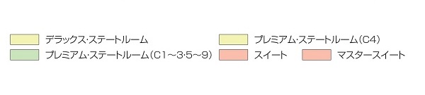 - ツインベッド(C2, C3, C6, C7, C8)、ダブルベッド(C1, C5, C9)