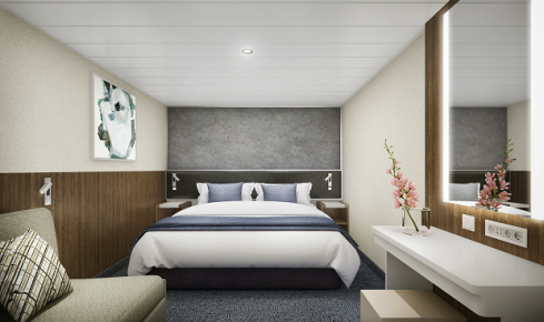 - クルーズで最もお手頃な料金の内側客室です。 最大4名様までご利用いただくことができ、クイーンサイズベッドになる2台のベッドと、他2名様分の予備の寝具をご用意しています。