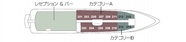メインデッキに位置し、角窓、大理石の床、ガラスと人工大理石のシャワーを備えたバスルームを備えています。全11室のうち9室は、寝具の配置が自由自在です。客室には、個別の空調システム、DVDプレーヤー付きテレビ、ミニ冷蔵庫、セーフティボックス、デラックスアメニティ、バスローブを完備しています。