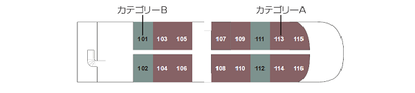 - カテゴリーAの客室はダブルベッドまたは、ツインベッド。広々としており、大きな窓からは、寄港地のユニークな景色を楽しむことができます。客室には、シャワー付きバスルーム、個別の空調システム、有線音楽、薄型テレビ(衛星チャンネル)、内線電話、ミニ冷蔵庫、ミニ金庫、ヘアードライヤー、アダプター(220V)が完備されています。