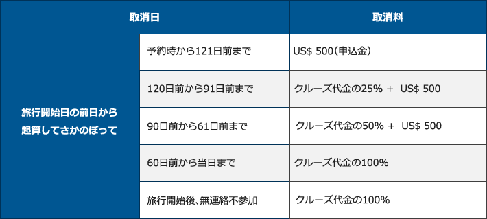 | 残金のお支払 | 旅行開始日の120日前までにクルーズ代金残金をお支払いただきます。 |